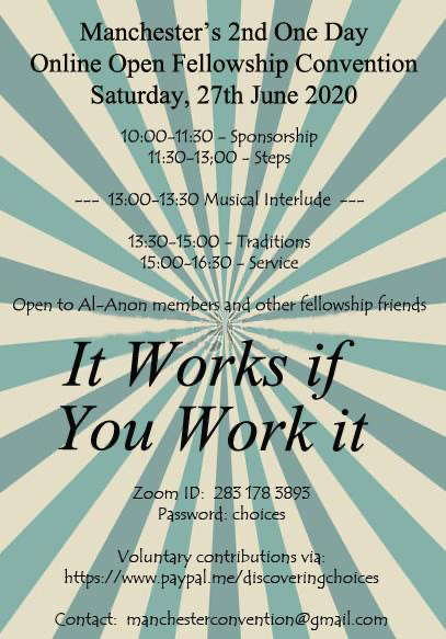 | Manchester's 1st Online Open Al-Anon Convention | 23rd May | Saturday | 10am - | Zoom | ID: 283 1783893 Password: choices | |