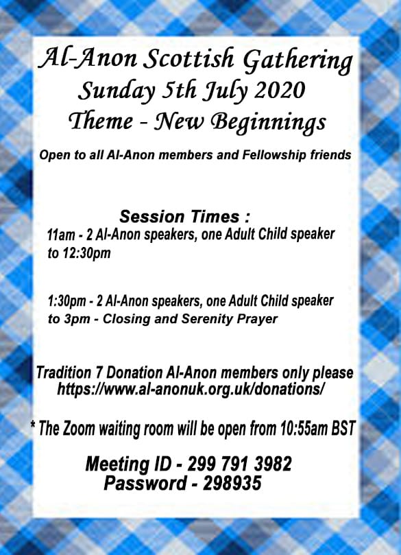 | Al-Anon without borders | 9th /10th May | Saturday and Sunday | US Pacific standard 8am Europe start 5pm UK 4pm | Zoom | Meeting ID: 787 37 8014 Password: 912936 | hhtps://zoom.us/j/787378014 |